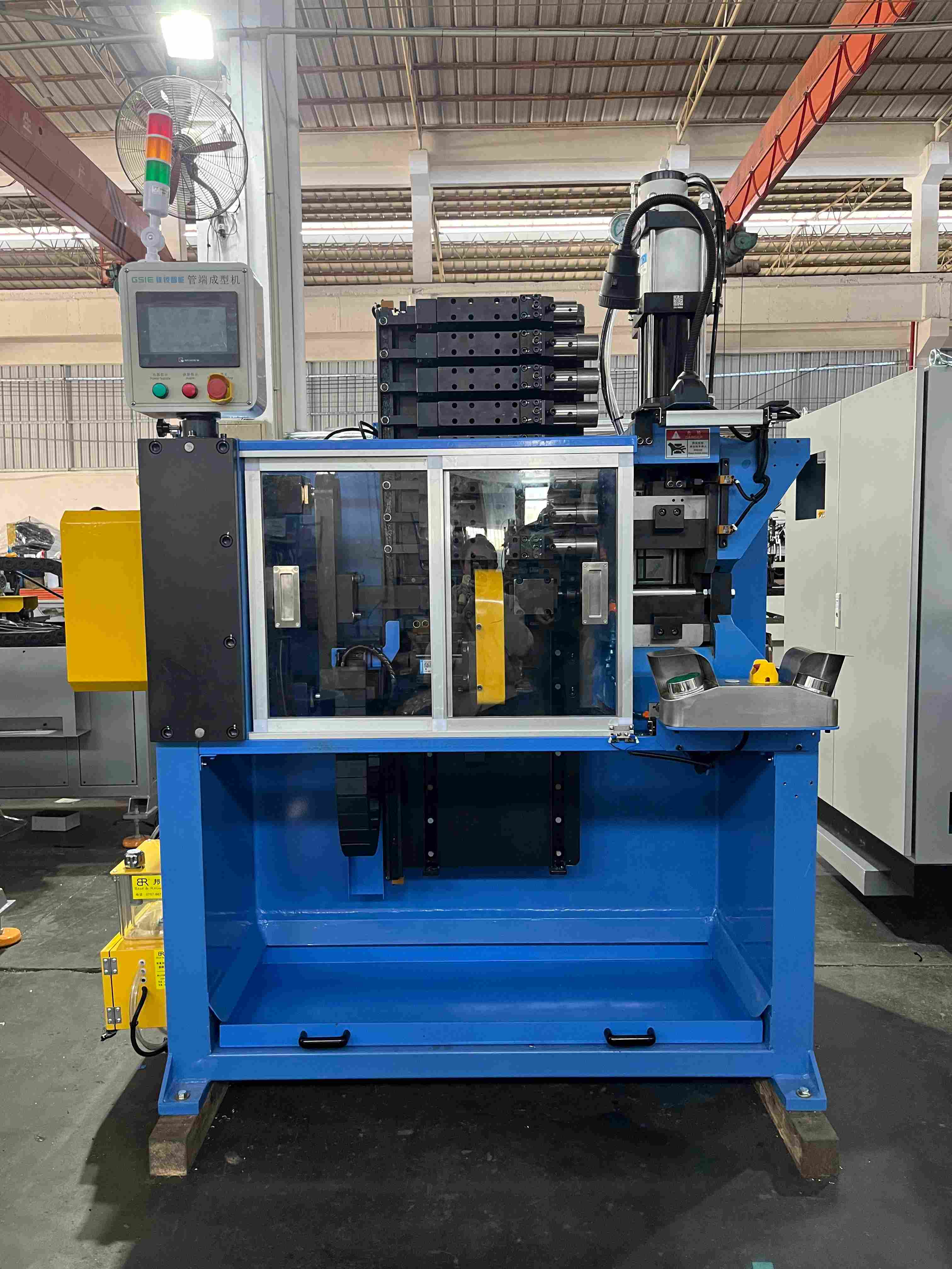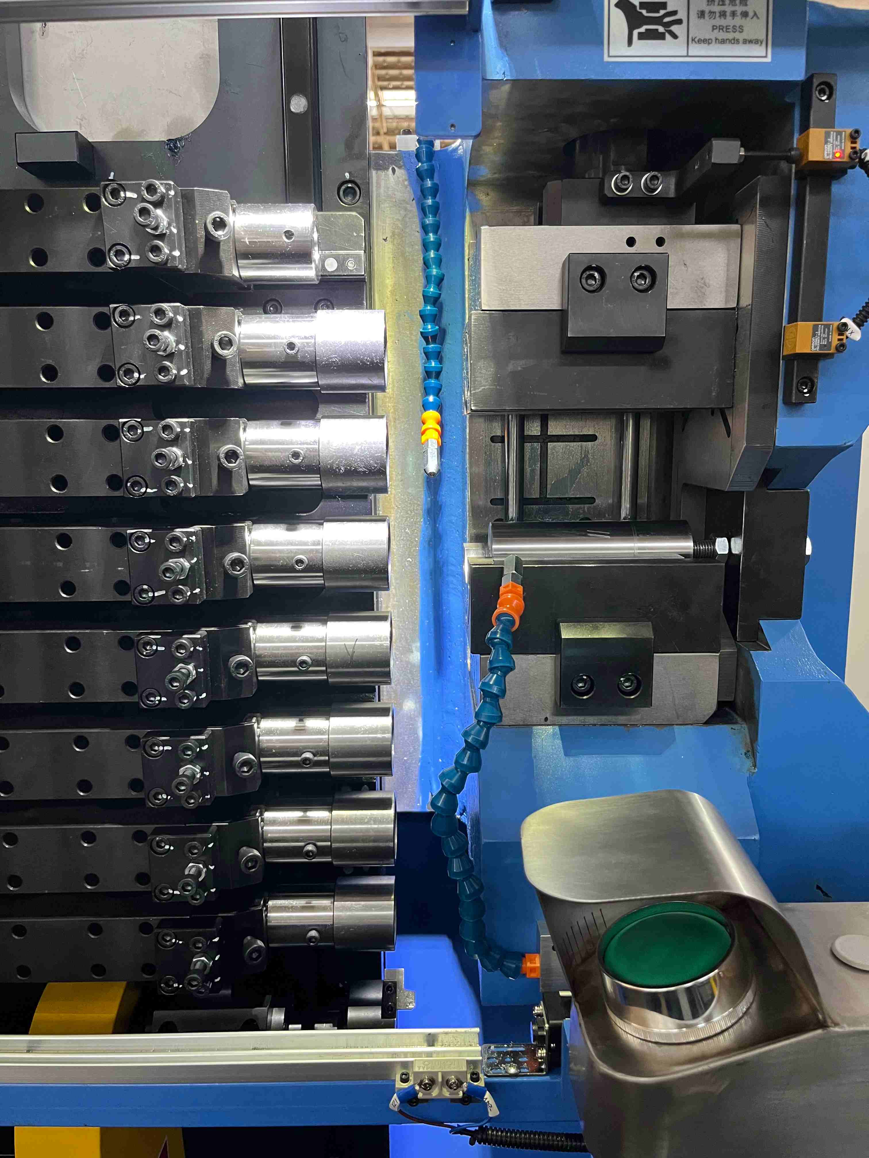 This high-performance eight-station electric forming and chamfering machine integrates tube extrusion and chamfering into a single platform. Its eight servo-positioned forming stations work in sync with a dedicated